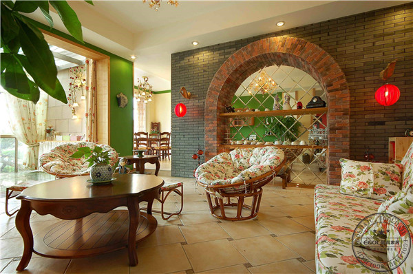 歐式田園風格,設計上講求心靈的自然回歸感,給人一種撲面而來的濃郁氣息。把一些精細的后期配飾融入設計風格之中,充分體現設計師和業主所追求的一種安逸、舒適的生活氛圍。這個客廳大量使用碎花圖案的各種布藝和掛飾,歐式家具華麗的輪廓與精美的吊燈相得益彰。墻壁上也并不空寂,壁畫和裝飾的花瓶都使它增色不少。鮮花和綠色的植物也是很好的點綴。