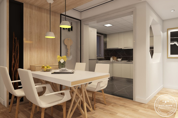 餐廳空間一般使用燈具、木質家具搭配,還可營造出北歐一貫的自然與簡潔。白墻上再添置一些置物架設計,擺放飾品增添居室活力。
