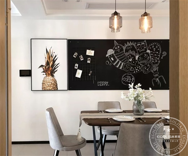 業主比較喜歡簡單、不復雜浮夸的東西;因此易高家居設計建議文藝范設計處理大白墻,定做一塊黑板,旁邊掛畫使用女主的畫作“金色菠蘿”與整體木色調完美融合。當然,畫作是可以跟隨業主需求自由更換;“黑板報”也可以根據不同節目而自由修改。此處,家居設計師將全屋定制個性定制體現的淋漓盡致。