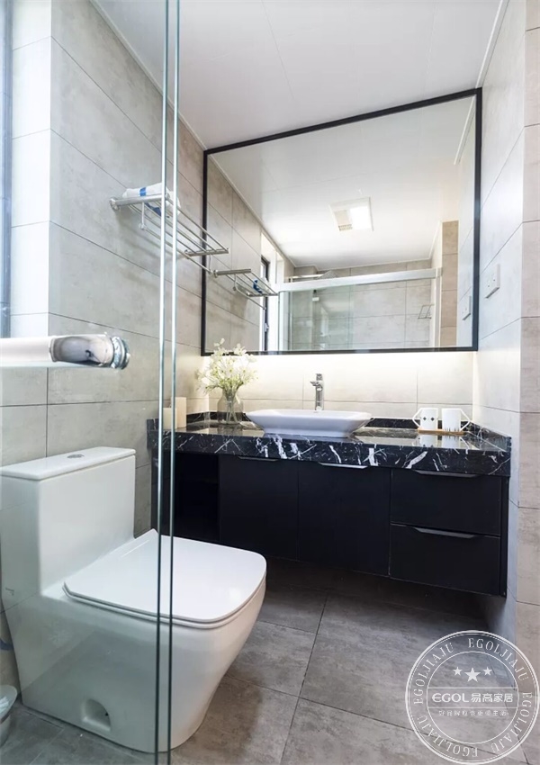 因臥室已經有了梳妝臺,所以,給業主在衛生間設計安裝的是整面的鏡子,在視覺上營造空間變大之感。