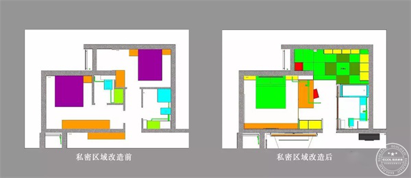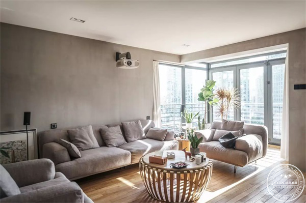 客廳的沙發呈東西方向擺放,客廳陽臺間安裝落地門,讓室外景觀更好的融入客廳。在客廳東西向承重墻的北側原本是一個用于分離各室的過道,過道的幾扇門分別是兩個衛生間和兩個臥室。