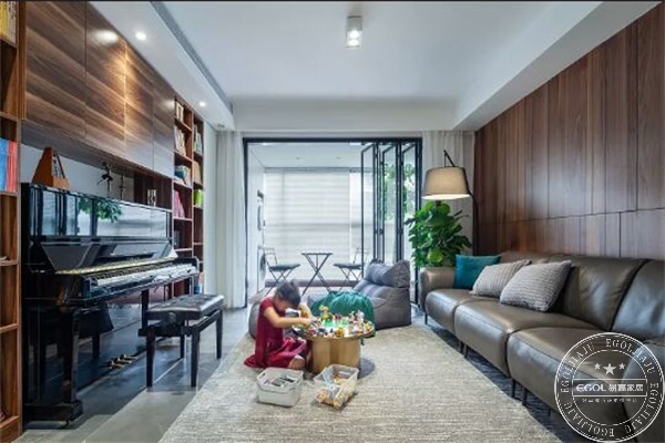 整組書柜,選擇局部開放,局部封閉空間,來進行收納鋼琴、小提琴、書箱等物品。書柜邊上的吊袋是原來家里帶來的,客廳并沒有采用傳統的茶幾,滿足平常放茶杯,果盤,以及充當孩子玩具的小桌幾,小茶幾便攜性,可以隨時移開,增加孩子活動空間。朋友來訪,盤坐著,躺在,很愜意的侃大山,放下手機,看看書,聊聊天異常愜意。