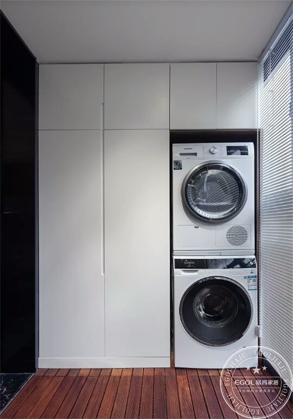 東邊收納柜收納了上下疊放的洗衣機烘干機,同時隱藏了拖把池。西邊收納柜可以放置從超市買回生活用品,同時可以放置清潔工具等物品,簡潔柜門設計,配上防腐木,放置休閑座椅,優化陽臺的休閑與實用。