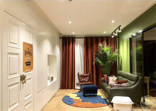 巨型收納柜長達6米多,猶如“大白墻”;地墊墊高三公分,沒有茶幾;不擔心娃在地上翻滾碰到頭。照明設計方面,采用冷暖色調搭配;整體色調統一且和諧。