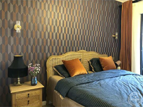主臥的色彩敲定順序是-墻紙-衣柜-窗簾。客廳級別的燈放置在臥室里,和壁燈形成一套,把橘色絲絨窗簾照的發金光。