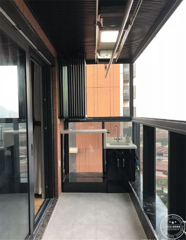 陽臺裝修配色黑白灰為主,上下層錯開,裝修成陽光房,使用黑色的生態板吊頂。