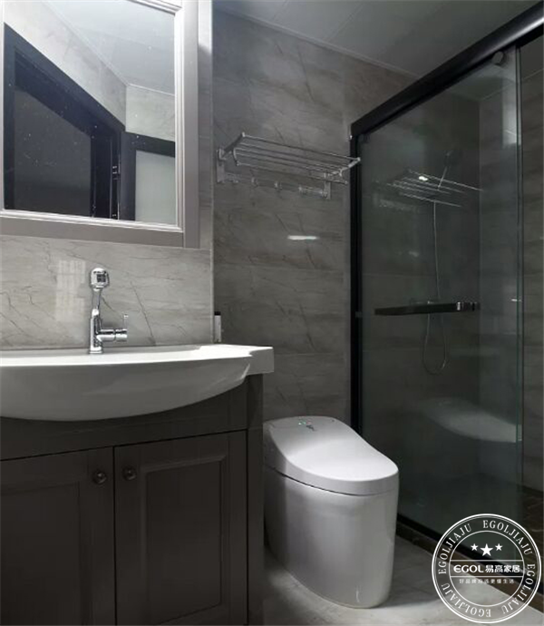 洗手間的馬桶用智能的,洗手臺采用的是鏡柜設計,再也不要擔心無處安放的化妝品,納鞋底瓶瓶罐罐了。