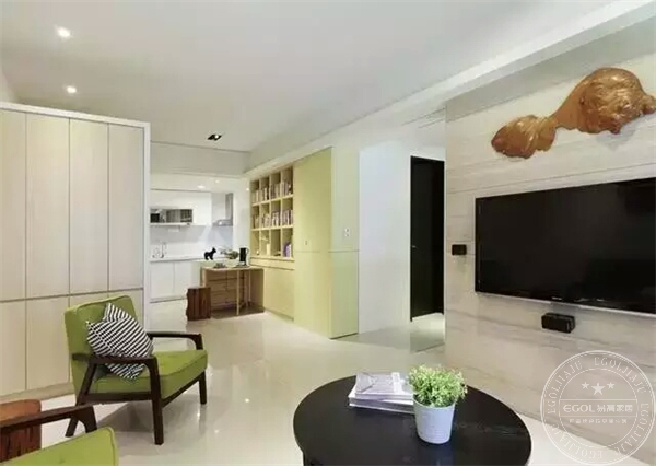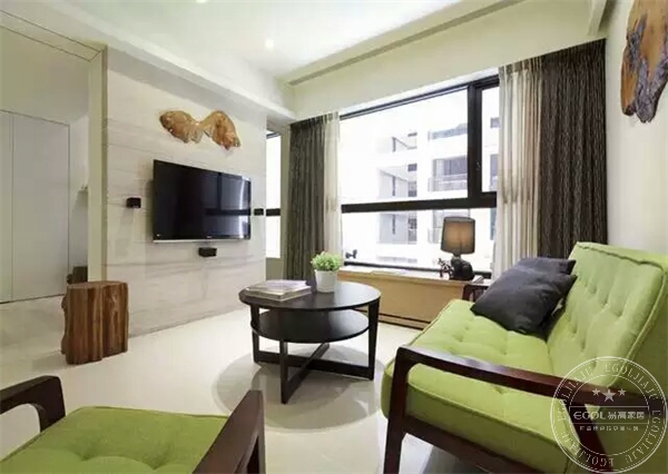 客廳的搭配以淺色系為主,茶幾和沙發是配套的,裝飾的空間色彩相對來說不是很壓抑,簡單的淡綠色能夠緩解視覺上的疲勞。