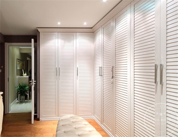 一般來說,如果可以找出面積在4平米以上的空間,就可以考慮制作幾組衣柜門和內部間隔,來做成嵌入式的設計。像嵌入式設計的衣帽間空間利用率高,容易保持清潔。
