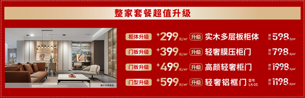 廣大業(yè)主在購買整家套餐基礎(chǔ)上,只需+299元/㎡即可將柜體升級(jí)為實(shí)木多層板,+399元/㎡即可將門板升級(jí)為輕奢膜壓柜門,+499元/㎡即可將升級(jí)為高顏輕奢柜門,+599元/㎡即可升級(jí)為輕奢鋁框門,不同價(jià)位滿足不同品質(zhì)需求,搭配隨心選,輕松定制理想家!