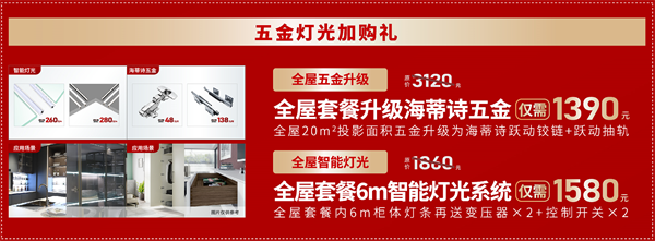 預(yù)算有限的話,也可以考慮19800全屋套餐,僅需19800元,就能獲全屋18平米柜體定制,除了贈(zèng)送高顏廚柜7㎡+時(shí)尚墻板3㎡+免漆木門1樘外,更可免費(fèi)升級(jí)超ENF級(jí)別環(huán)保易居板+防潮水槽柜,一站配齊,一步到位,超高性價(jià)比誰能不心動(dòng)?