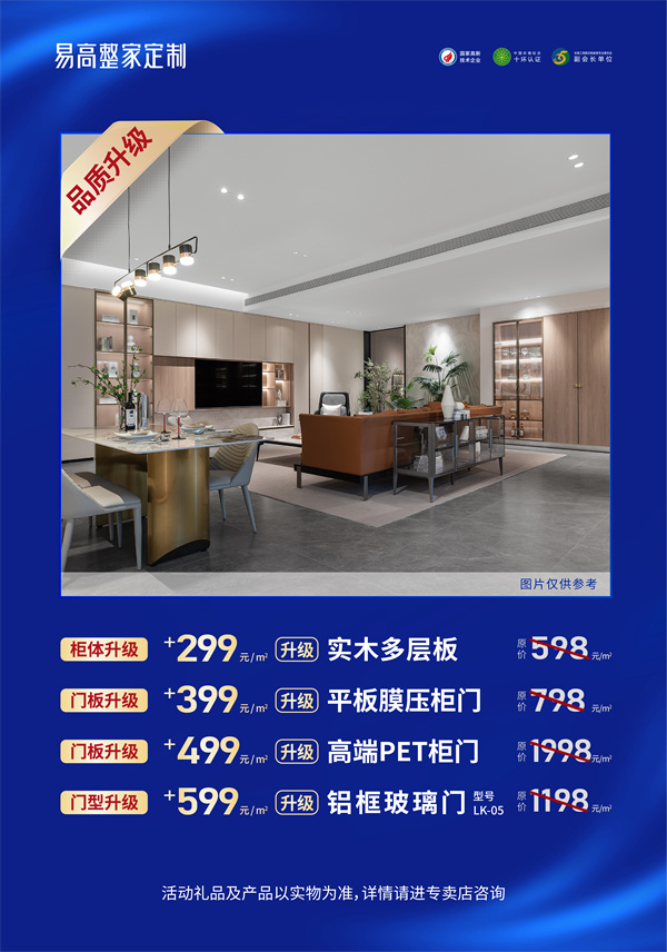 此次還推出品質(zhì)升級活動,旨在用最美的價格裝出最好的品質(zhì)。+299元/㎡柜體升級實木多層板;+399元/㎡門板升級平板模壓門;+499元/㎡門板升級高端PET柜門;+599元/㎡門型升級鋁框玻璃門。