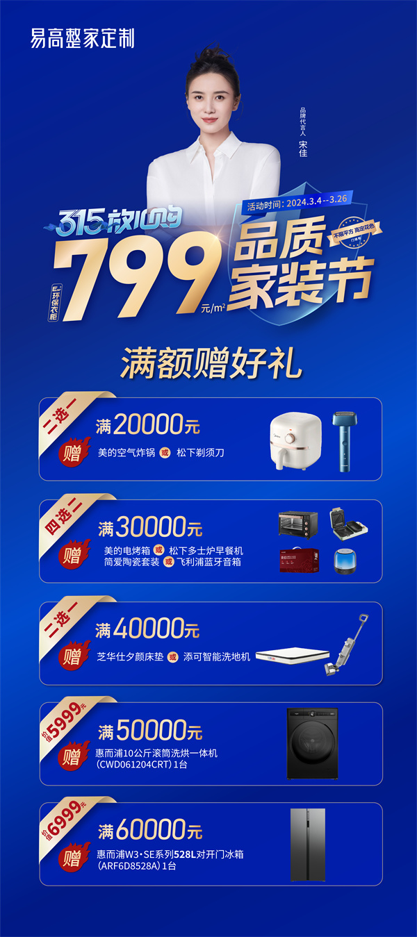 除了價格優(yōu)惠,易高整家定制還開啟了“滿額贈好禮”模式!3.15活動期間,滿20000元送美的空氣炸鍋1臺/松下剃須刀;滿30000元送美的電烤箱/松下多士爐早餐機+簡愛陶瓷套裝/飛利浦藍牙音箱;滿40000元送芝華仕床墊1張/添可智能洗地機...除此之外,還有很多超值福利哦!