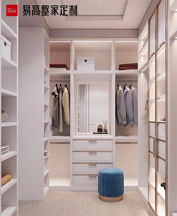 基礎照明用嵌入式筒燈,功能照明選柜內LED燈帶,裝飾照明可用迷你壁燈。要預留插座,選擇環保E0級板材,南方需注意防潮處理。預算有限時可考慮宜家PAX系統或金屬架+布簾組合。