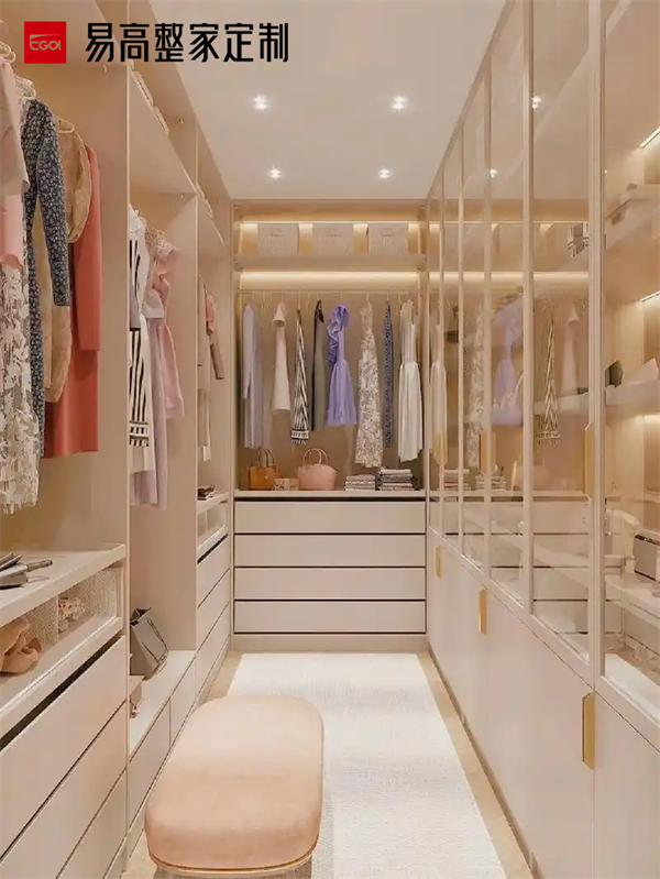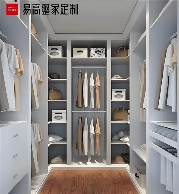 開發垂直空間:到頂設計(2.4m高),頂部40cm放換季物品,底部20cm設抽拉鞋架。推薦多功能組件(升降衣桿、旋轉穿衣鏡、折疊熨衣板)和收納神器(蜂窩內衣盒、伸縮置物架、真空壓縮袋)。注意柜體深度不超過60cm,層板最好可調節。