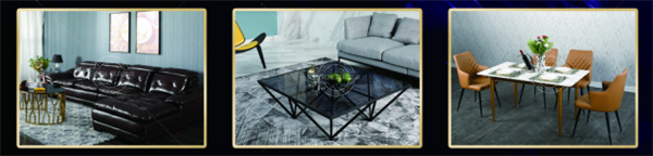 B、現代簡約皮質沙發+簡約茶幾+輕奢風餐桌椅
