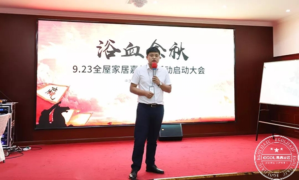 “燃戰心,凝熱血,全力以赴奮戰9.23”。40戶參與此次工廠行的加盟商代表及公司銷售精英近200人在易高家居合肥總部參加了誓師大會啟動儀式。