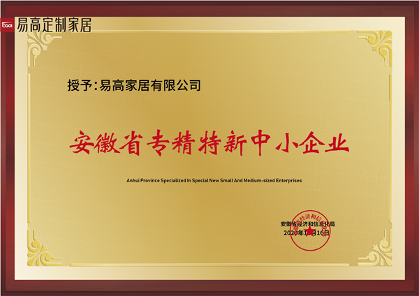 “安徽省專精特新企業”是指具有“專業化、精細化、特色化、新穎化”特征的優秀企業,該獎項評選條件嚴、入選門檻高,對企業的營業收入、研發經費支出、技術創新能力等方面有著嚴苛要求。作為定制家居領域的領軍企業,易高家居自成立之初,便高度重視科研工作,堅持走自主創新之路,形成了鮮明的行業特色和競爭優勢。