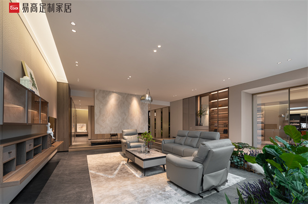 整體布局開闊明亮,運用深淺色系的碰撞豐富視覺層次,增加時尚感。懸浮式電視柜和收納柜摒棄復雜裝飾,以流暢線條勾勒簡約隨性的生活姿態,呈現純凈優雅的休閑會客空間。一抹綠植的加入釋放空間無限活力,北歐風情滿滿。