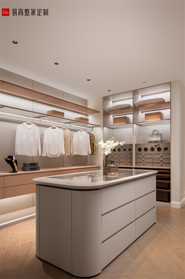 設(shè)計師巧妙運用直線和曲線的交匯,創(chuàng)造出剛?cè)岵?jì)的大氣美感。開放式衣帽間系統(tǒng)和升降梳妝臺藏露有序,將空間層次層層推進(jìn)。流動的步履中,舉手投足間都縈繞著奢雅、隨性的氣息,舒享品質(zhì)人居。