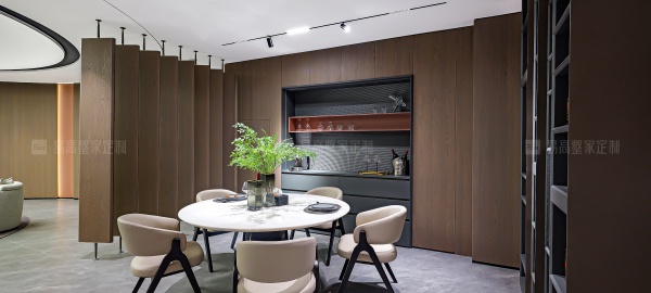 通透的屏風(fēng)和開放格設(shè)計相輔相成,呼吸感穿梭其中,生動演繹意式美學(xué)的優(yōu)雅與從容。線性燈帶沿著柜體輪廓隨性流淌,明暗交匯間,無限放大光影美感。