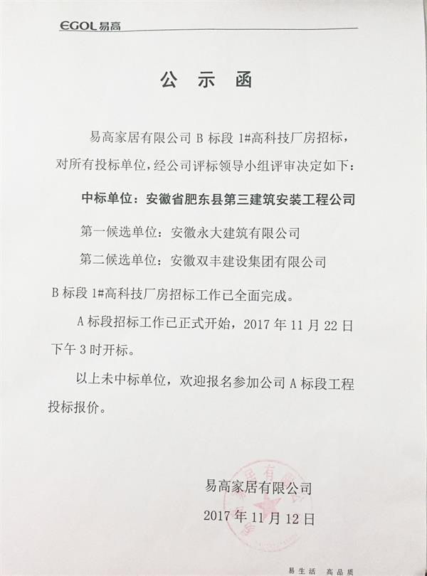 關于易高家居有限公司B標段1#高科技廠房招標結果公示