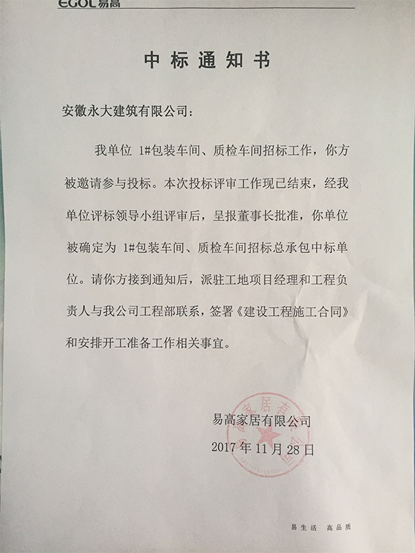我單位1#包裝車間、質(zhì)檢車間招標工作,你方被邀請參與投標。本次投標評審工作現(xiàn)已結(jié)束,經(jīng)我單位評標領(lǐng)導(dǎo)小組評審后,呈報董事長批準,你單位被確定為1#包裝車間、質(zhì)檢車間招標總承包中標單位。請你方接到通知后,派駐工地項目經(jīng)理和工程負責人與我公司工程部聯(lián)系,簽署《建設(shè)工程施工合同》和安排開工準備工作相關(guān)事宜。